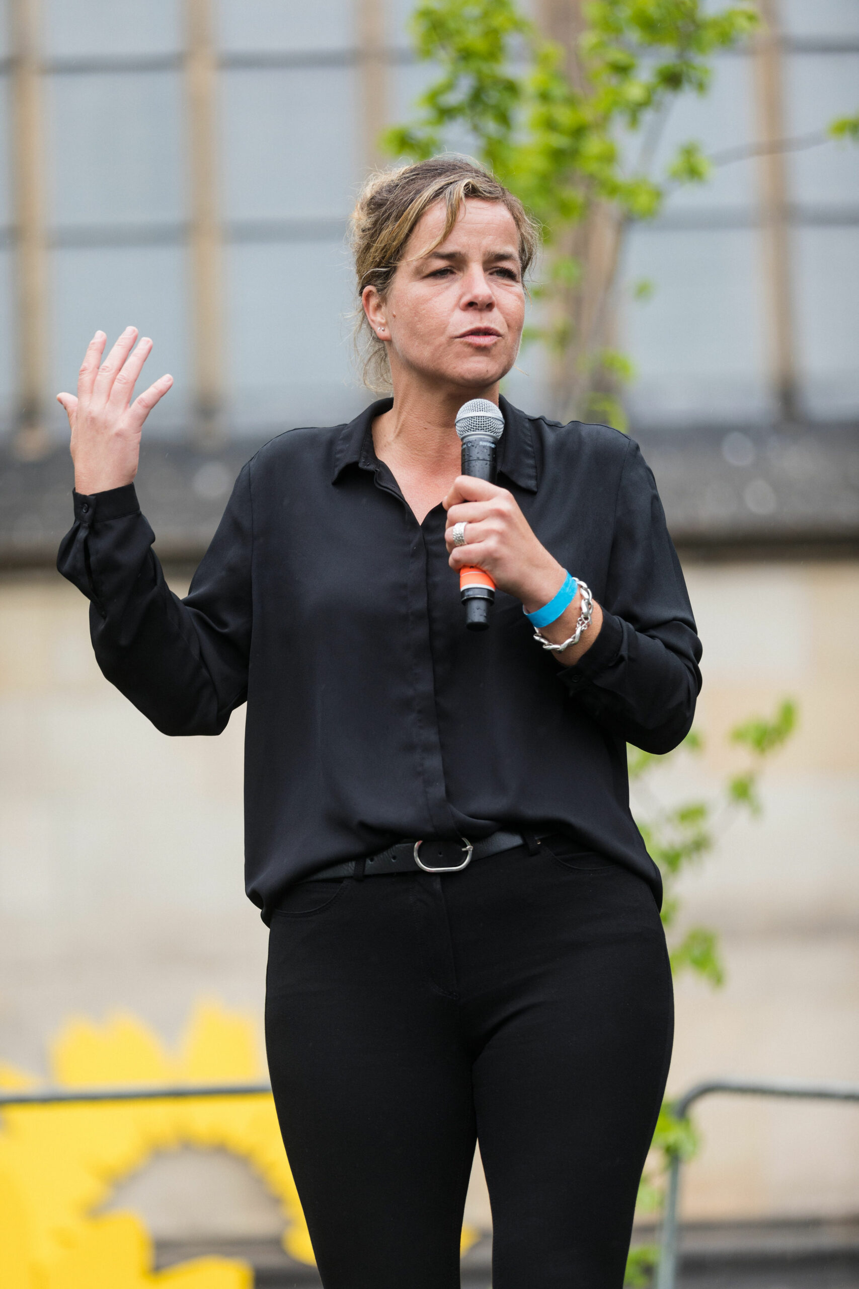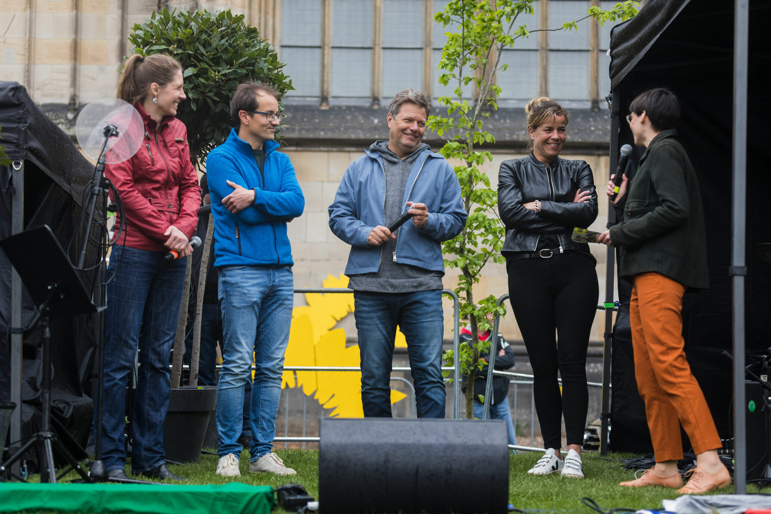 Die NRW-Spitzenkandidatin Mona Neubaur erinnert daran, dass rechtsextreme Parteien bei vergangenen Wahlen keine Chance in Münster hatten und begeistert das Publikum mit einer Aussicht, dass der Düsseldorfer Landtag ab dem 15. Mai frei von undemokratischen Parteien sein könnte. Im Anschluss begrüßte sie Vizekanzler und Wirtschaftsminister Robert Habeck.