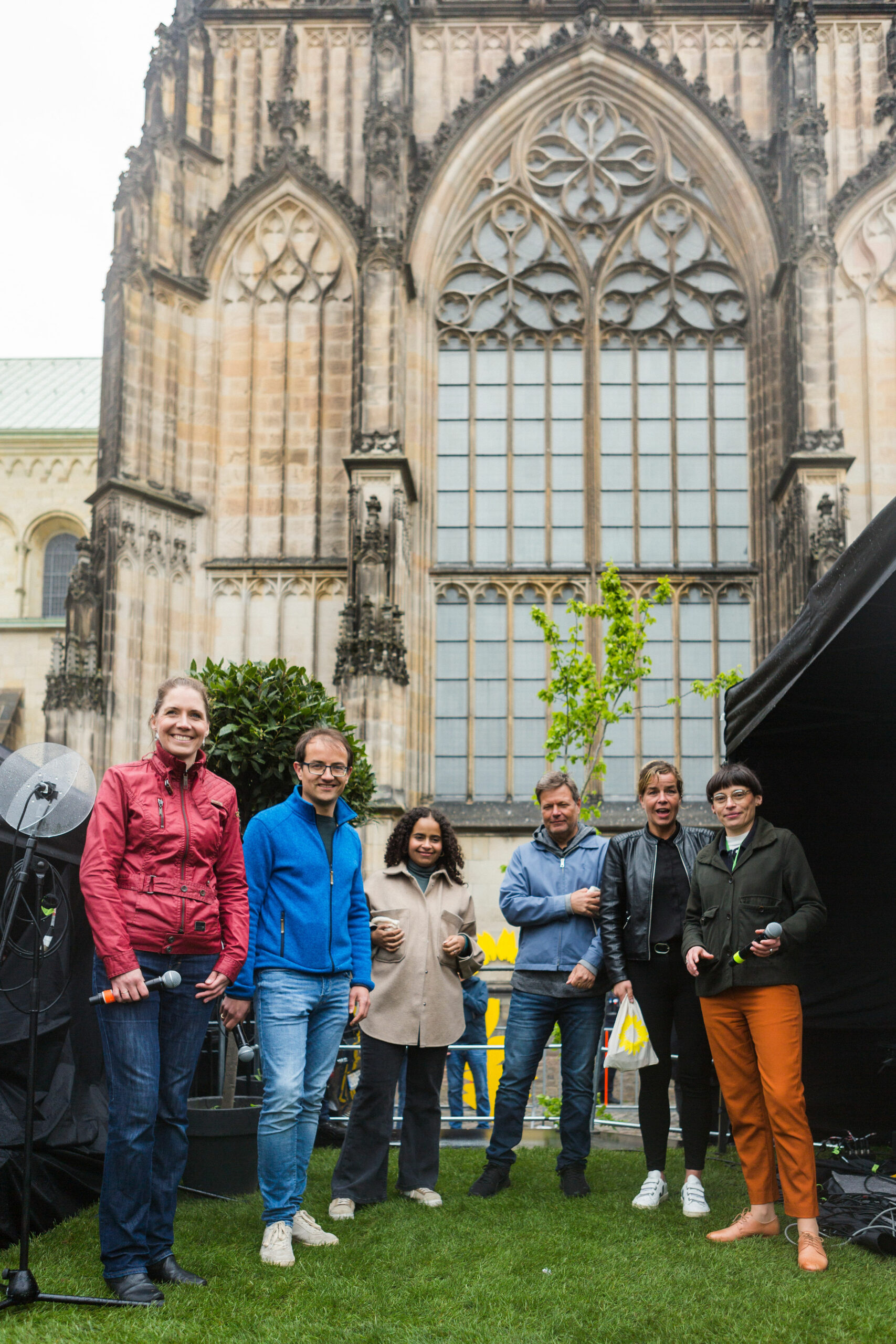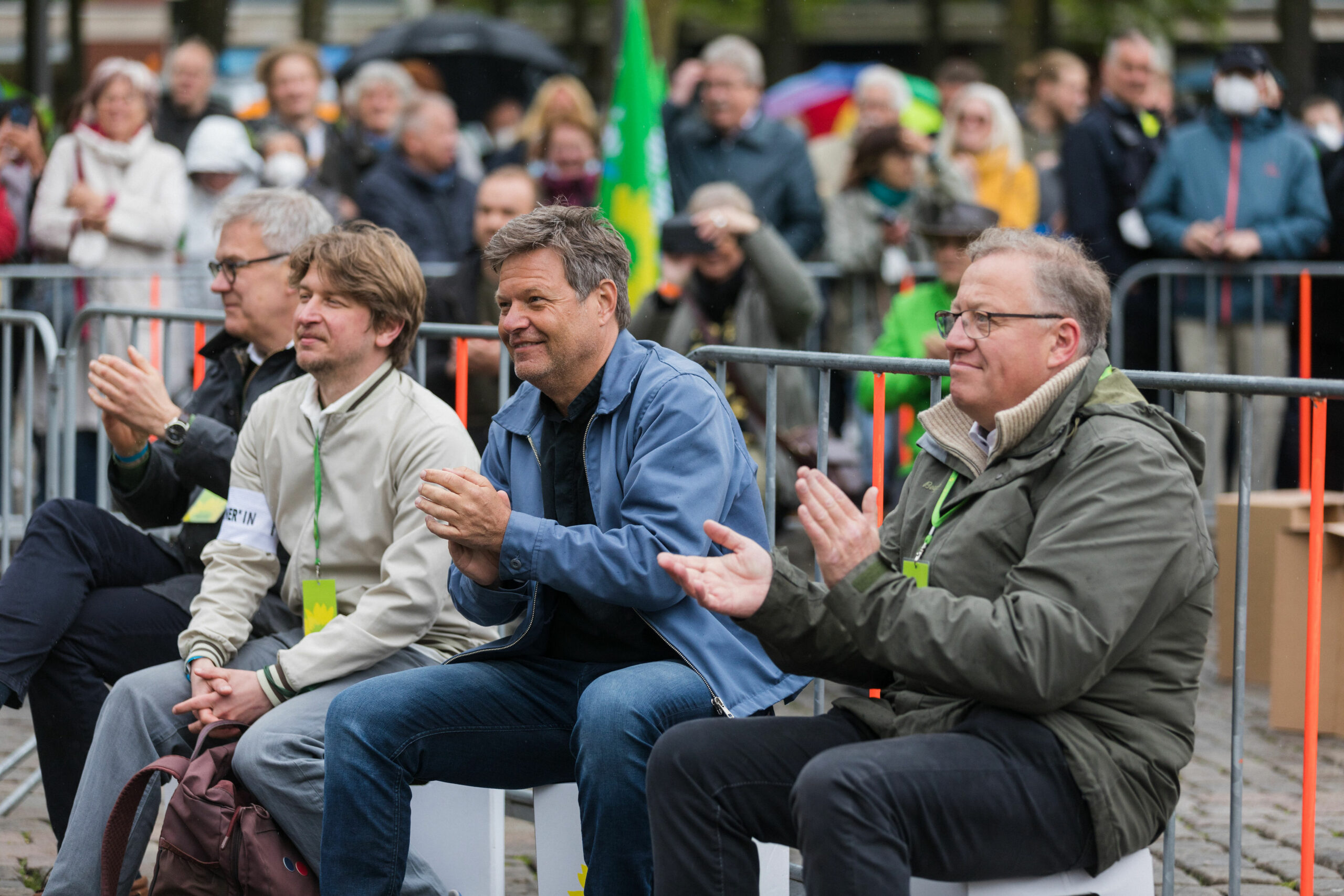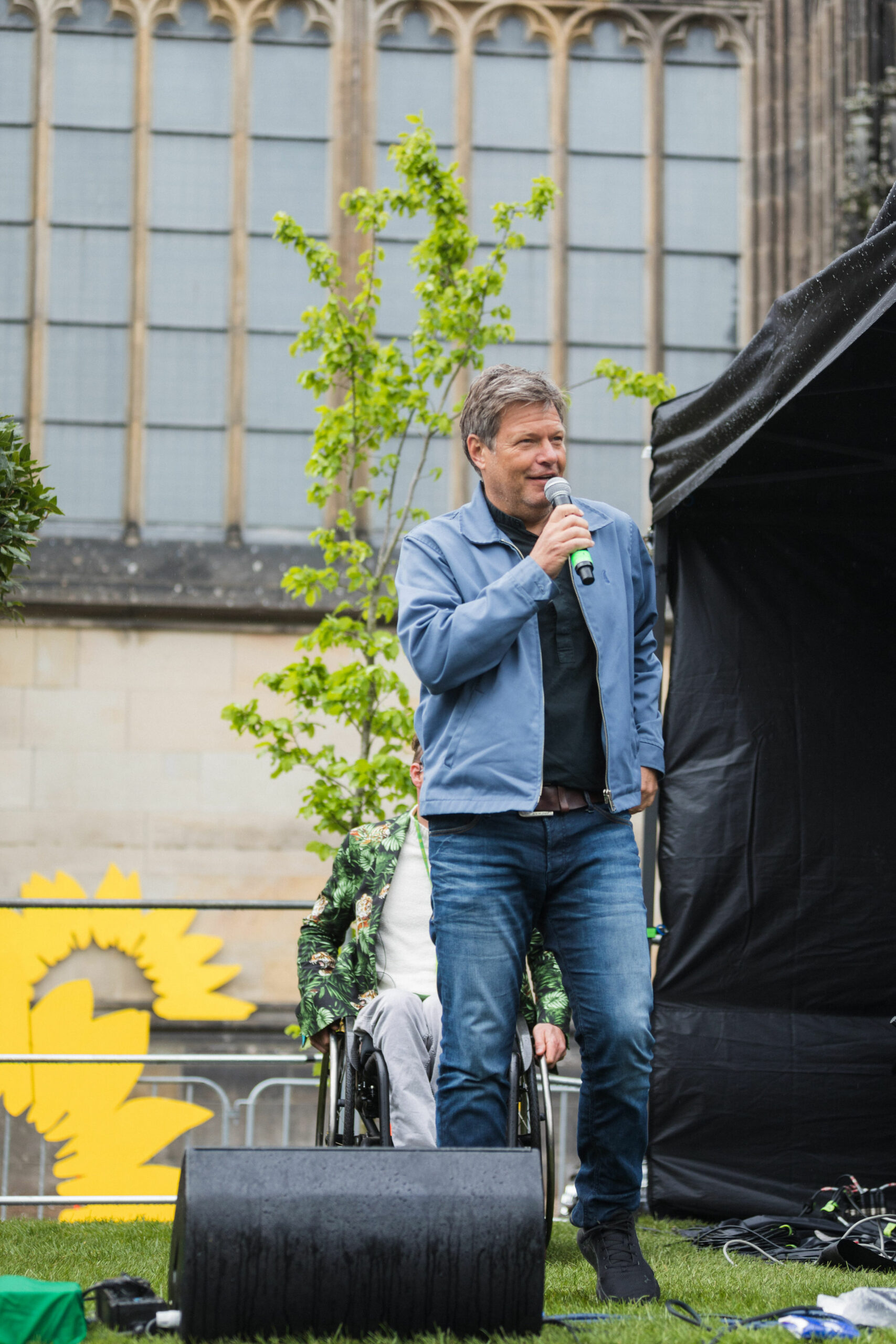 Am Montag, 25. April war Wirtschaftsminister und Vizekanzler Robert Habeck erneut zu Gast in Münster und sprach gemeinsam mit der NRW-Spitzenkandidatin Mona Neubaur vor rund 3000 Menschen auf dem Münsteraner Domplatz. Der Coesfelder Landtagskandidat Dennis Sonne moderierte die Veranstaltung und begrüßte neben Habeck und Neubaur auch die Münsteraner Direktkandidat*innen Josefine Paul, Robin Korte und Dorothea Deppermann sowie die Bundessprecherin der Grünen Jugend, Sarah-Lee Heinrich. Die Münsteraner Band Home to Paris begeisterte mit energiegeladener Musik und verbreitete trotz Regen gute Stimmung.