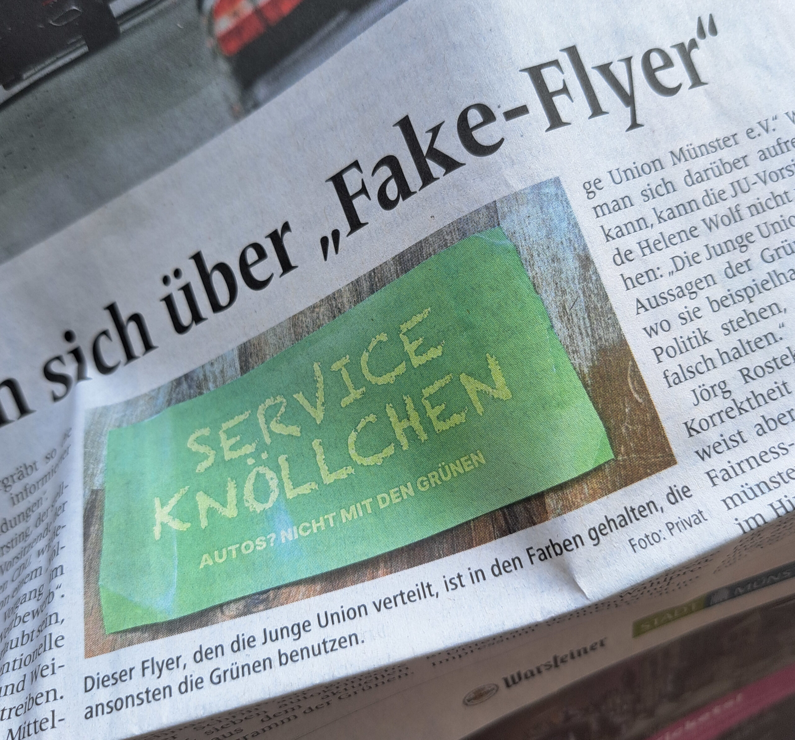 Vergangene Woche meldeten sich die Westfälischen Nachrichten bei uns GRÜNEN mit einer kuriosen Beobachtung: Leser*innen hatten der Redaktion Wahlflyer zugespielt, die „laut Impressum von der JU Münster in Umlauf gebracht“ wurden.