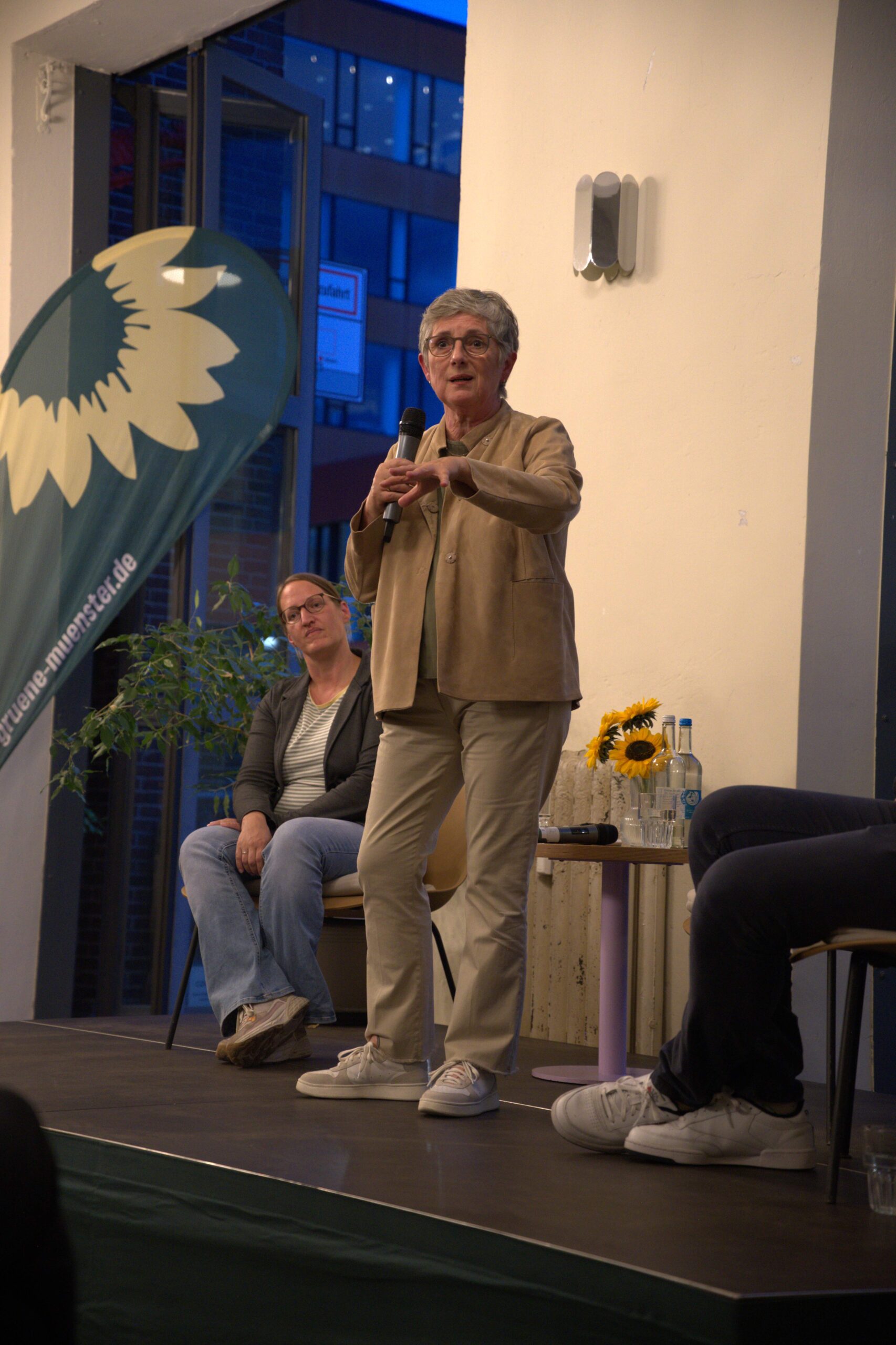 Am gestrigen Donnerstag war die Fraktionsvorsitzende der Grünen Bundestagsfraktion Britta Haßelmann zu einem Wahlkampfbesuch in Münster. Gemeinsam mit Albert Wenzel, Ratsmitglied und Direktkandidat für das Schlossviertel, und über hundert Interessierten tauschte sie sich über kommunalpolitische und bundespolitische Themen aus. Die Bandbreite der Themen reichte dabei von der Regelung von Balkonkraftwerken und städtischen Fördertöpfen über konkrete bundespolitische Fragen etwa zum Bundesverfassungsgericht oder dem Umgang mit der AfD bis hin zu allgemeinen Debatten über die Rolle der Grünen in der Opposition auf Bundesebene. Zum Abschluss legte auch der Grüne Oberbürgermeisterkandidat Tilman Fuchs noch einmal seine Prioritäten als Münsters Oberbürgermeister dar.