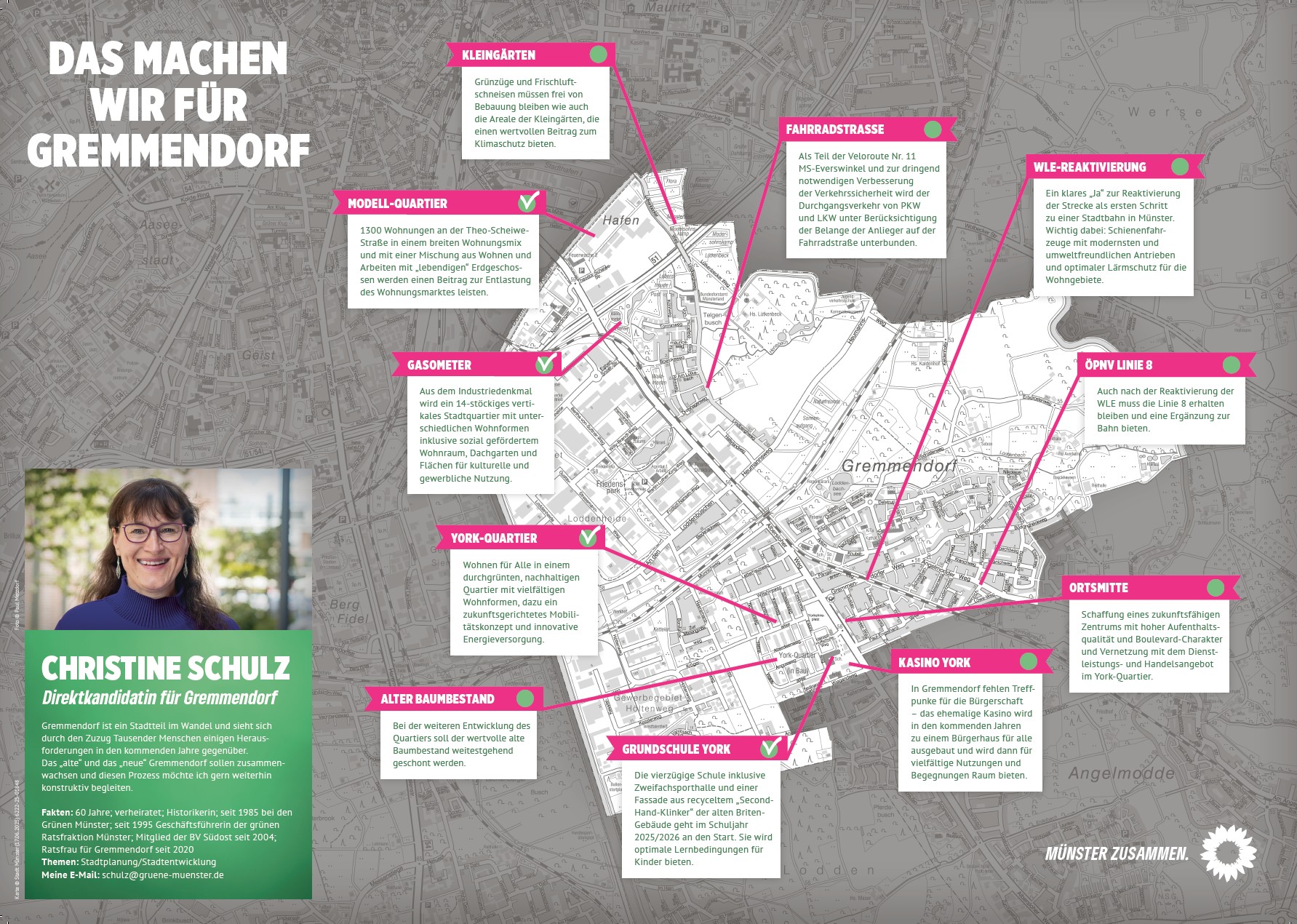 Gremmendorf wächst in den kommenden Jahren um ca. 11.000 Menschen. Der Integration dieser Bewohner*innen; dem leider immer noch zunehmenden PKW-Verkehr auf dem Albersloher Weg; dem Ausbau der unzureichenden Einzelhandels-Infrastruktur; mehr Kita-Plätze und Sportflächen – und diesen vielen weiteren Aufgaben im Bezirk möchte ich mich in der nächsten Wahlperiode gern widmen.