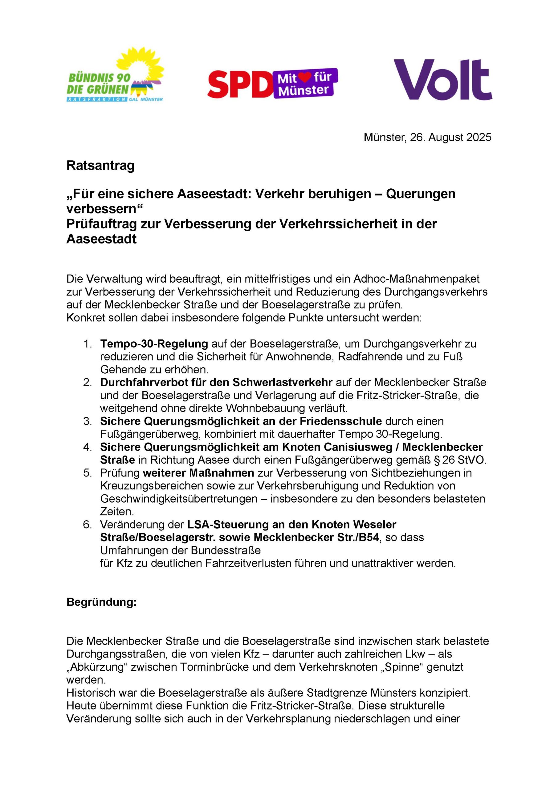„Für eine sichere Aaseestadt: Verkehr beruhigen – Querungen verbessern“ Prüfauftrag zur Verbesserung der Verkehrssicherheit in der Aaseestadt